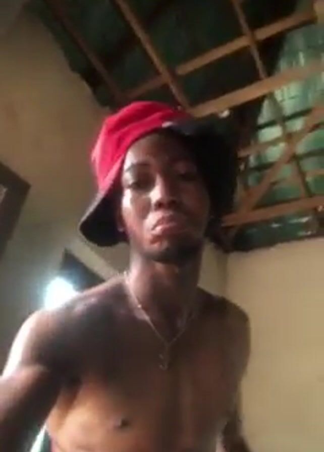 A shirtless dark-skinned man with a goatee and a red and black baseball cap backwards is in a room with a wooden ceiling. He is smiling and looking at the camera. The video is taken from a low angle. The man has a gold chain around his neck. There is a doorway visible in the background.