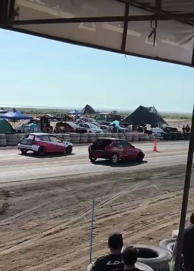 drag race between two cars, a pink hatchback and a burgundy sedan, on a paved track. The event is being watched by a group of spectators standing behind a low wall made of tires. A blue tent is partially visible, and the scene is framed by a metal structure. The sky is clear and blue, and the landscape is a flat, open area with other tents and vehicles in the distance. The cars accelerate quickly at the start, leaving a trail of exhaust.