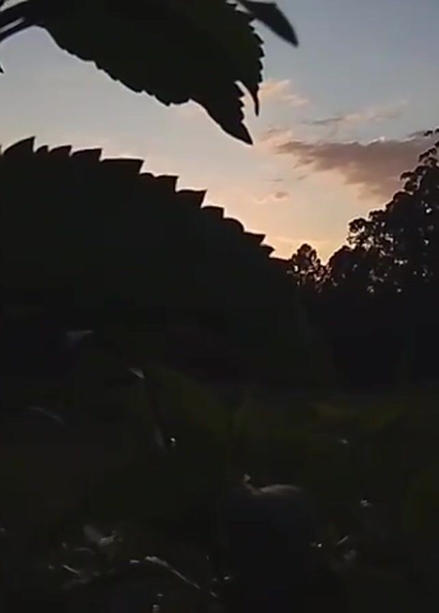 sunset viewed through foliage. The sky is a gradient of light blue to orange, with scattered clouds. The sun is visible as a bright orange disk just above the silhouetted treeline. The foreground is dominated by dark, blurred foliage, partially obscuring the view.