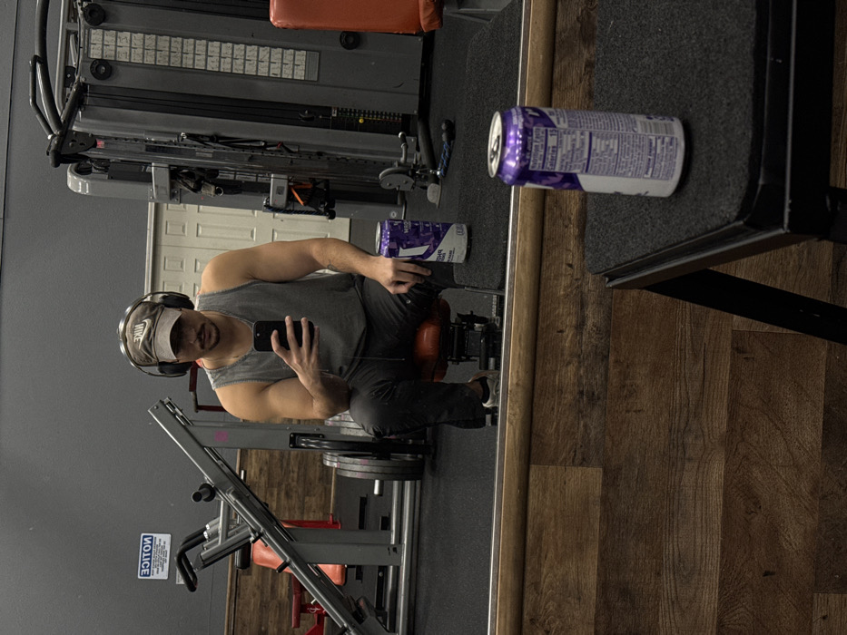 A person in a gray tank top, dark pants, and a Nike hat takes a mirror selfie in a gym. They are seated on gym equipment with weights visible nearby. There are headphones around their neck. Two cans of a purple beverage are visible, one on the machine and one on a nearby table. The gym has gray walls and wood-look flooring. Exercise equipment is visible in the background.