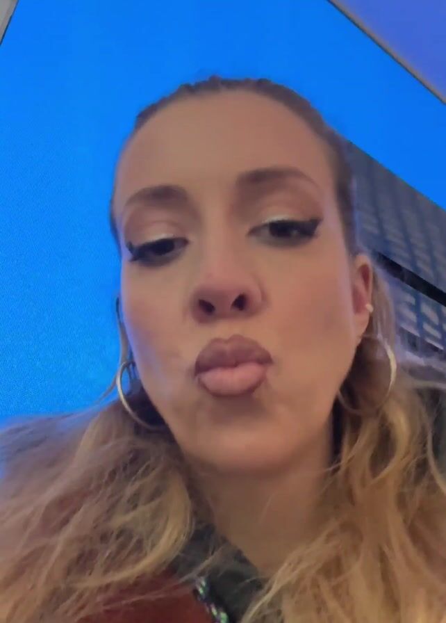 A woman with blond hair and makeup is looking directly at the camera with pursed lips