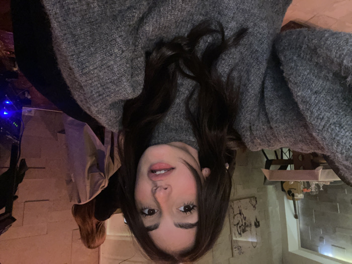 A young woman with dark hair and brown eyes wearing a gray turtleneck sweater looks at the camera. She is positioned in the center of the frame. Background elements include a computer tower with blue lights, a beige coat, and a table with glasses and a guitar. The image has been rotated, positioning her upside down. A decorated wall is visible to the right.