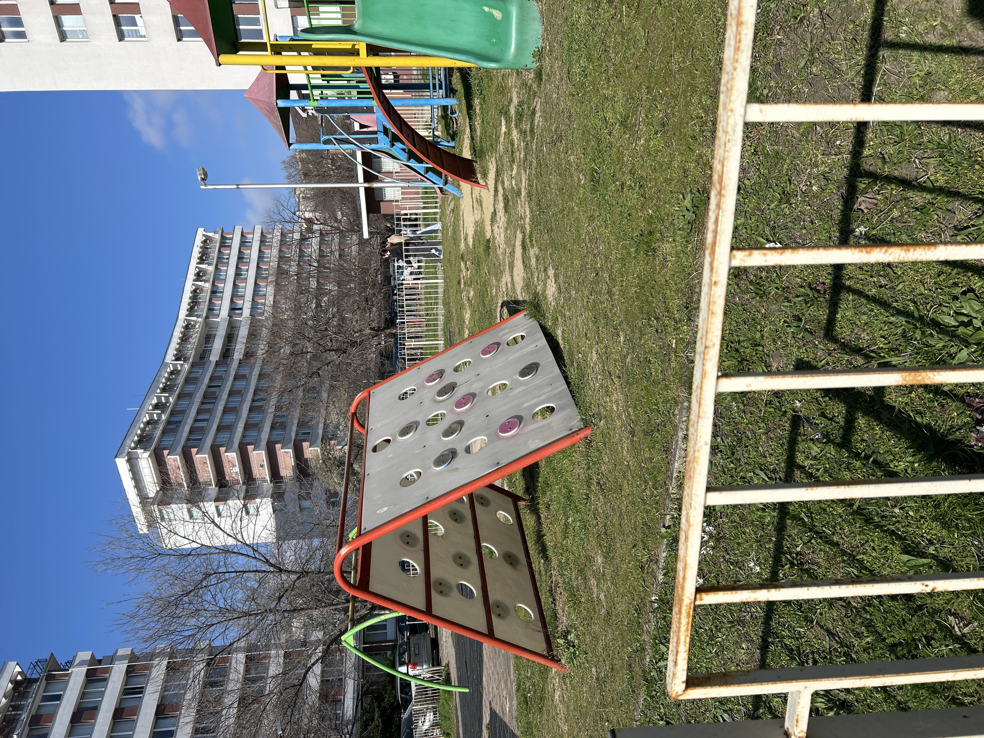 This image depicts a sunlit urban playground scene in Varna, Bulgaria, characterized by a mix of recreational structures and residential architecture. In the immediate foreground, a weathered, off-white metal fence, exhibiting rust, partially obstructs the view of a patchy green lawn with areas of exposed soil. The midground features two primary playground structures. To the left, a triangular climbing wall with a red metal frame holds two gray-white panels containing multiple circular cutouts, some with pink, green, or blue internal rings. To the right, a multi-component playground unit displays a green slide, yellow support poles, blue climbing elements (including a spiral staircase), and a red arched section, topped by a red conical roof. Further left and back, a green metal arch, consistent with a swing set frame, is visible. In the background, several tall, multi-story residential buildings dominate the skyline under a clear blue sky with minimal cloud cover. A prominent white high-rise building with a distinct wavy or scalloped roofline and multiple balconies with red-brown accents stands in the center-left. Another white residential building is partially visible on the far right. Numerous bare deciduous trees are interspersed between the playground and the buildings. A street light pole stands centrally in the background. A white metal fence separates the playground area from an adjacent paved surface where several parked vehicles, including a silver hatchback, are visible. Two individuals, appearing to be adults, are observed walking behind this white fence in the mid-background. The scene is illuminated by natural sunlight, casting distinct shadows from the playground equipment and the foreground fence onto the grass.