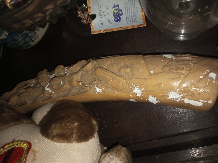 A carved, tan-colored tusk-like object with intricate relief artwork sits amongst other items. The carving appears to depict a scene with figures in traditional dress. Damage is visible as white spots marring the surface of the carving. It's partially obscured by a plush toy with a dark brown ear. Nearby, a tag reading "Butterfly Pea" can be seen along with glass vases. The arrangement suggests a collection of diverse objects placed together.