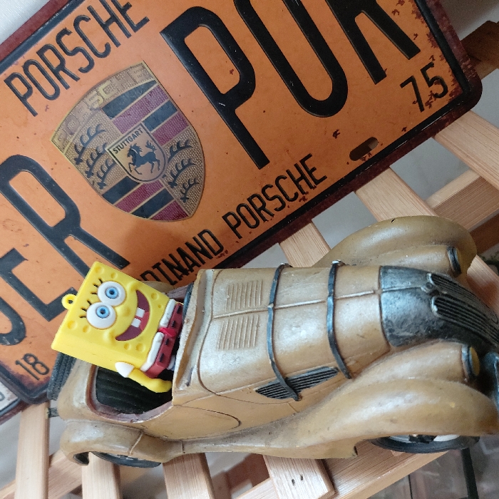 - "A vintage car figurine, painted in shades of tan and grey, features Spongebob Squarepants as the driver" by FM-xMf1b2, licensed under CC BY 4.0