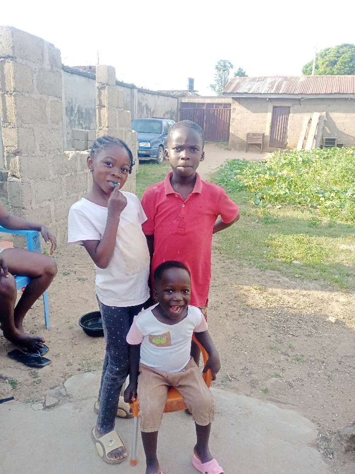 The image displays four individuals outdoors in an area identified as Unknown, Unknown. Three children are positioned in the foreground and mid-ground, facing the camera. A girl, estimated to be 6-8 years old, stands center-left, wearing a light-colored t-shirt, dark patterned leggings, and two-toned sandals; her right hand is near her mouth. To her right stands an older boy, estimated to be 8-10 years old, dressed in a red polo shirt and dark shorts, with hands on his hips. Below him, a young boy, estimated to be 2-4 years old, sits on a small orange plastic chair, wearing a white t-shirt with pink sleeves, tan shorts, and pink slide sandals; he is smiling broadly. Partially visible on the far left is an individual with bare legs and feet, seated on a blue plastic stool. A black plastic bowl containing liquid is situated on the ground near this individual's feet, alongside a pair of dark flip-flops. The ground is a mix of uneven dirt and concrete. In the background to the left, a partially constructed wall of concrete blocks is visible. To the right, a patch of green vegetation with broad-leaf plants is present. Further back, a blue sedan is parked near a weathered concrete block wall and a brown metal gate. A small, light-brown building with a rusted corrugated metal roof stands to the right, featuring a wooden door and a small window; a wooden bench and planks lean against it. A black elevated water tank and distant trees are discernible under a bright, daylight sky.
