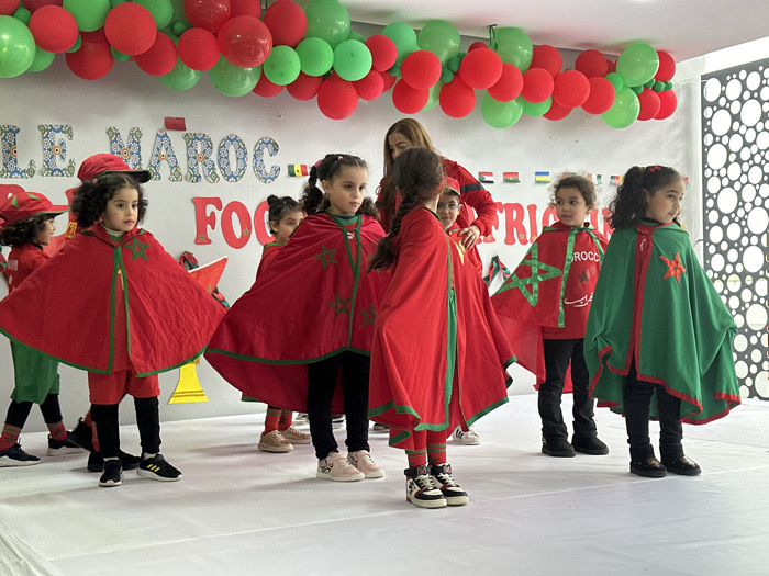 Young children wearing red and green capes with a star on them stand on a white stage. Behind them are red and green balloons, and writing on the wall that includes "Le Maroc". The children are mostly girls, with one wearing a red cap. A woman is standing amongst them. There are some flags representing different African countries hanging on the back wall.