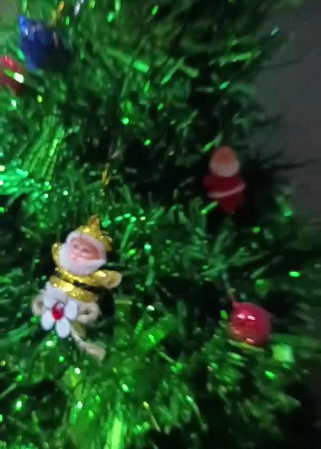 small, shiny green artificial Christmas tree decorated with small ornaments. The ornaments include miniature Santas, red balls, and a small wrapped gift. The tree is sitting on a table or shelf against a light gray wall. There is background music.