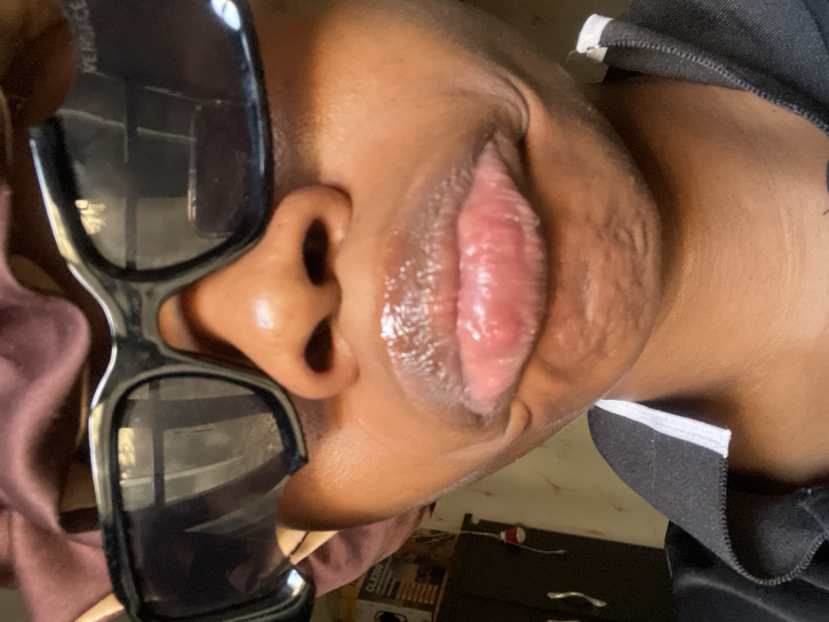A close-up image depicts the lower facial area of an individual, from the forehead line to the upper chest, within an indoor setting