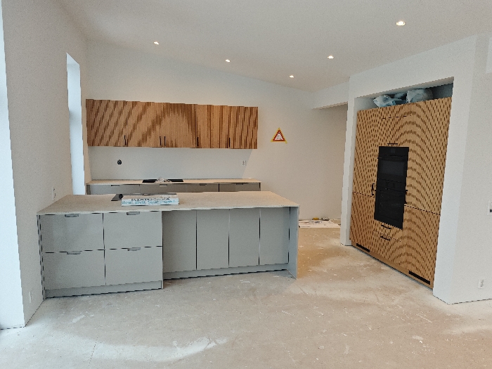 This image captures an interior view of a kitchen space currently under construction or renovation in Hamar, Norway. The room features white painted walls and a white ceiling equipped with multiple recessed spotlights. The floor is an unfinished light gray concrete surface, exhibiting dust and construction debris. In the foreground, a light gray kitchen island with multiple drawers and cabinet doors is present, topped with a light-colored countertop. A white rectangular package, marked with "MONTERING" (Norwegian for "assembly") and other text, rests on the island countertop. Along the back wall, a matching light-colored countertop is installed, integrating a black stovetop or hob. Above this, a series of wall-mounted wooden cabinets with a distinctive vertical pattern of diagonal grooves or slats are visible. To the right, a tall, built-in cabinet unit, constructed from wood with the same diagonal slat pattern, houses a central black glass-fronted appliance, likely an oven or microwave. Above this appliance, within the cabinet recess, light blue insulation or packaging material is visible. A yellow triangular warning sign with a black exclamation mark is affixed to the back wall, to the left of the tall cabinet unit. A narrow vertical window or opening is positioned on the far left wall. No individuals are present in the scene.