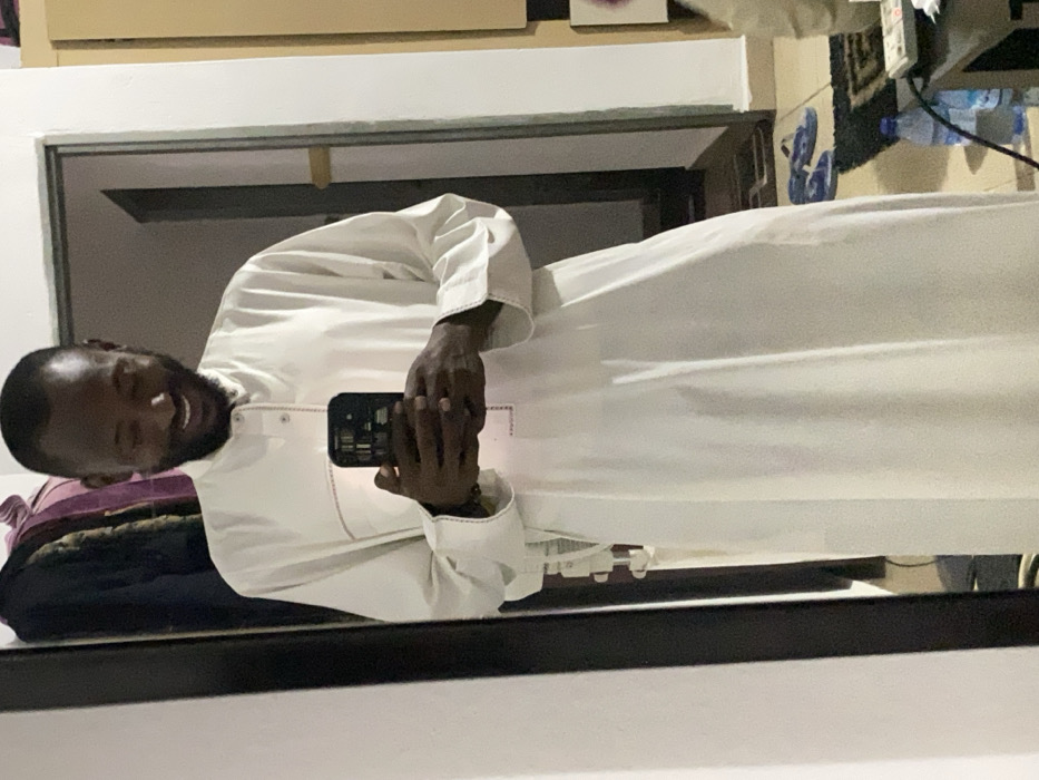 An adult male, with dark skin, short dark hair, and a beard, is depicted smiling while taking a mirror selfie indoors in Sabon Tasha, Nigeria. He wears a long-sleeved, collared, floor-length white garment, possibly a thobe or kaftan, featuring reddish-brown stitching on the placket and cuffs. He holds a dark-colored smartphone with both hands at chest level. The reflection reveals details of the room: clothing items are visible hanging on a rack behind him to the left. A doorway or cabinet edge is positioned behind him to the right. On the floor, a dark rug or mat is visible, along with a pair of blue flip-flops. To the far right, a dark surface holds a remote control, a white cord, and two plastic water bottles. The walls are light-colored.