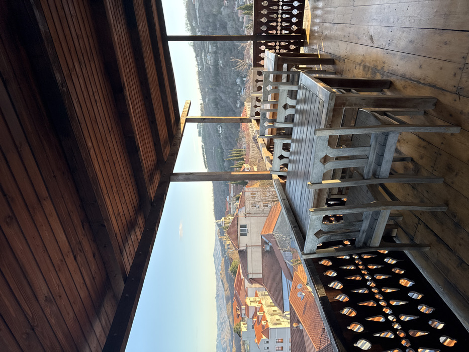 - "The image displays an elevated outdoor wooden terrace in Sighnaghi, Georgia, offering a panoramic view of the city under a clear blue sky" by FM-GMxhS2, licensed under CC BY 4.0