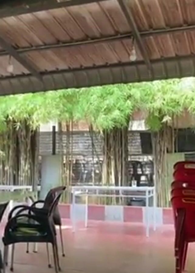 shaded outdoor area with tables and chairs. There are stacks of red chairs on the right. A row of bamboo plants lines the back of the area, providing a natural screen. The floor is tiled in a mix of red and beige. The ceiling is corrugated metal with a few hanging light bulbs. The area appears empty.