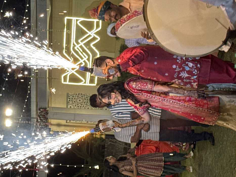 A wedding scene unfolds outdoors at night with celebratory fireworks. A smiling woman in a patterned red dress is flanked by a man in a striped shirt holding a sparking firework. Above them, a man in a red embroidered suit also holds a sparking firework. Behind them, drummers in traditional attire are visible. The scene is lit by building lights and the sparkling fireworks.