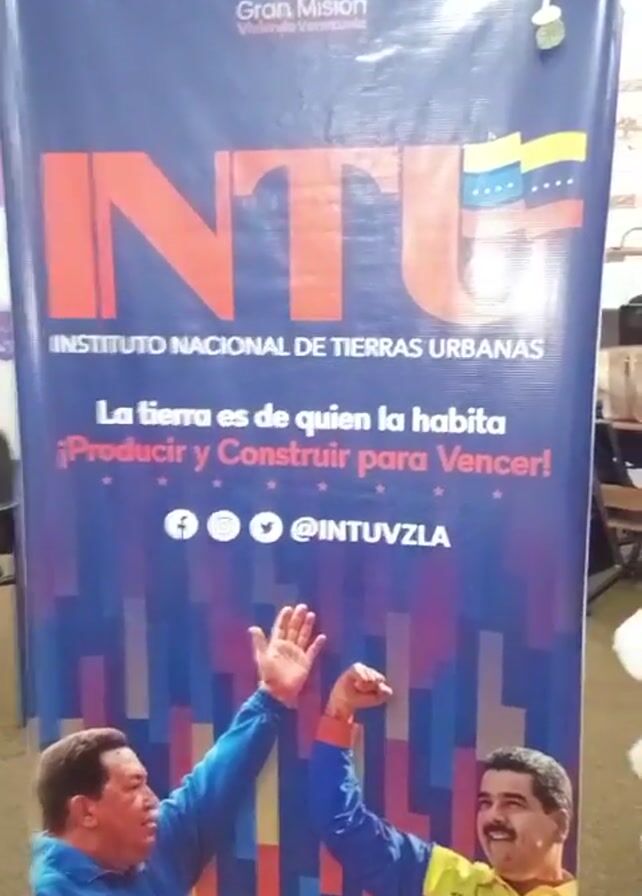 The video is a quick, shaky, and slightly out-of-focus pan across an indoor scene. The first shot is of a blue banner with text in Spanish, images of Hugo Chavez and Nicolas Maduro, and the Venezuelan flag. It appears to be an advertisement for the "Instituto Nacional de Tierras Urbanas." The camera then pans right to a decorated snowman prop. The snowman is rectangular, with a red hat, black button eyes, an orange carrot nose, a smiling mouth, and a scarf made of alternating white, red, and green squares. It has a row of four black buttons down its center. The background is blurry, but appears to be a room with furniture and plants.