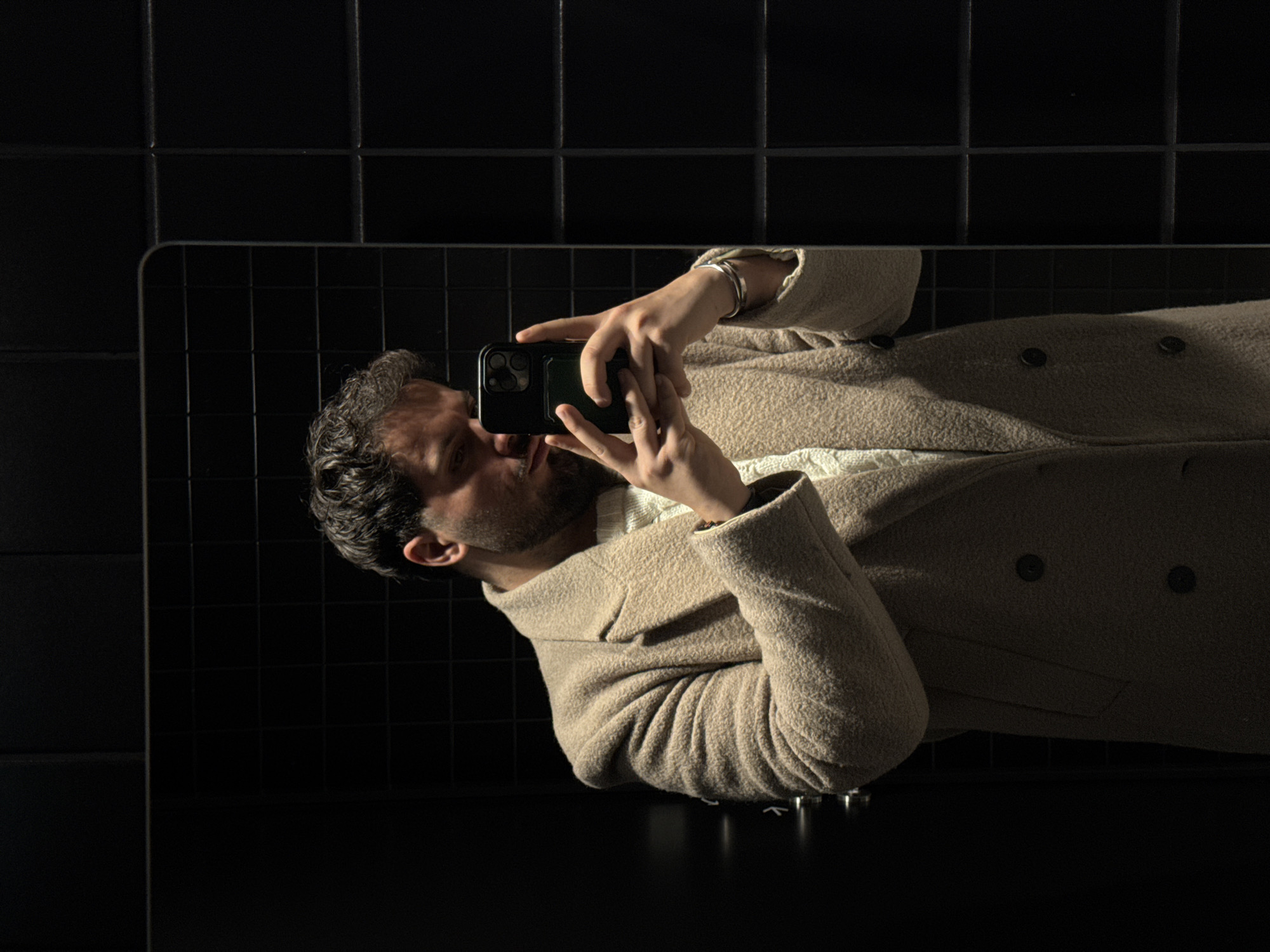 man in a beige overcoat, appearing to take a photo of himself in a mirror