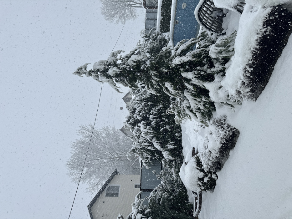 The image displays an exterior residential scene within Abinsk, Russia, captured during heavy, active snowfall. The entire visible landscape is covered in a thick layer of undisturbed white snow, with countless snowflakes suspended in the air against an overcast, light gray sky. In the foreground and mid-ground, a garden area features numerous coniferous trees and evergreen shrubs, all heavily encrusted with snow. A tall, prominent conifer stands in the mid-ground, slightly right of center, its branches completely obscured by snow. To the far right, a light blue swimming pool is partially visible, its surface and edges laden with snow. Adjacent to the pool, a dark, curved object with a lattice-like pattern, possibly a piece of outdoor furniture, is also covered in snow. On the left side of the mid-ground, a snow-covered horizontal structure, likely an outdoor bench or table, is situated. A dark-colored fence, possibly metal or wood, extends horizontally across the mid-ground, separating the garden from the background. In the background, a light-colored, two-story house with a dark roof and several windows is visible on the left. Parts of another building with a darker roof are discernible in the distance to the right. Bare deciduous trees, lightly dusted with snow, rise above the fence line. A dark utility line stretches horizontally across the upper mid-ground. No individuals, actions, or interactions are present in the scene.