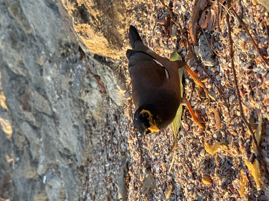 - "An outdoor, ground-level scene in Ban Ao Nang, Thailand, depicts a Common Myna (Acridotheres tristis) standing on a surface composed of crushed seashells, small pebbles, and dried organic debris" by FM-M5A4l2, licensed under CC BY 4.0
