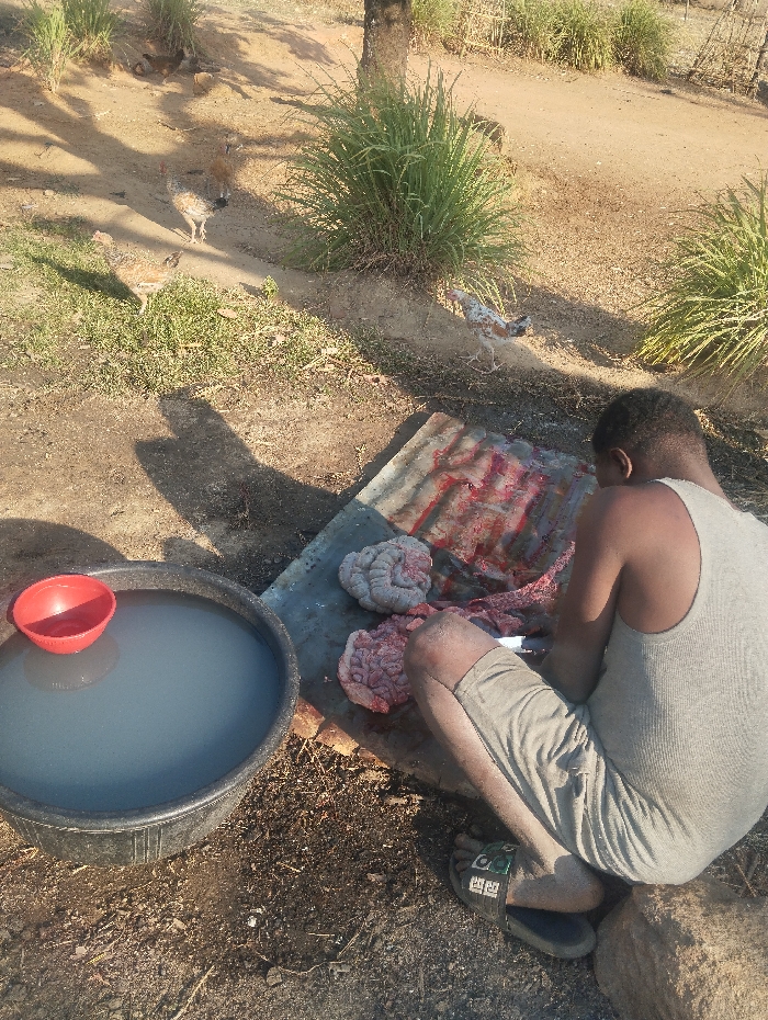 A man in a grey tank top and shorts sits outdoors next to a large bucket of water with a red bowl floating in it. He's cutting meat on a sheet of metal or plastic. Two lumps of what look like intestines are on the sheet. In the background, several chickens wander freely on the dirt ground. Grass clumps grow nearby. The scene appears rural or in a yard.