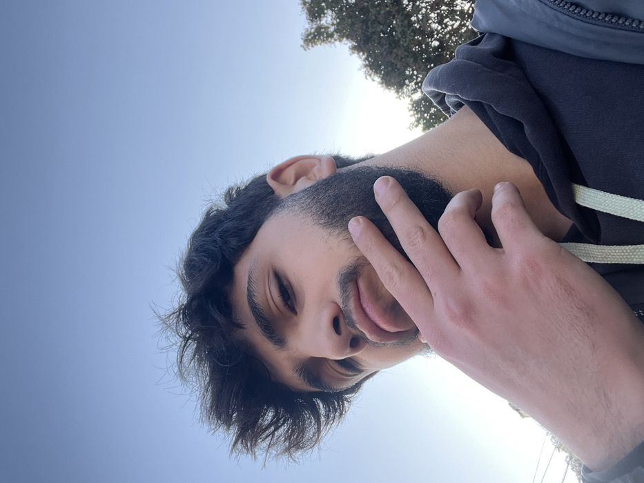 A person's face is angled upwards towards the sky. The sky is a pale blue with a tree at the top of the image. The person has dark hair, dark eyebrows, and a beard. Their hand is near their face, fingers slightly curled. They are wearing a dark hoodie with light-colored drawstrings. The overall lighting suggests it's daytime.