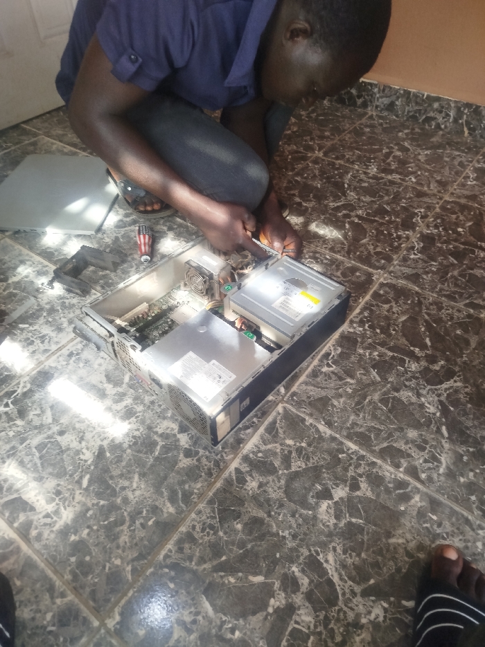 An individual with dark skin, wearing a blue short-sleeved collared shirt, dark trousers, and dark sandals, kneels on a marble-patterned tiled floor in Akwanga, Nigeria. The person is actively engaged in repairing or maintaining an open desktop computer tower. The computer's side panel, a light grey rectangular piece, rests on the floor nearby. Visible internal components of the computer include an optical drive, a power supply unit, and a motherboard with a small fan. A screwdriver with a red, white, and blue handle lies on the tiles, along with a dark, L-shaped metal bracket. Natural light, possibly sunlight, illuminates parts of the floor and computer, creating bright reflections. A second person's foot, wearing a black and white striped slipper, is partially visible in the lower right foreground.