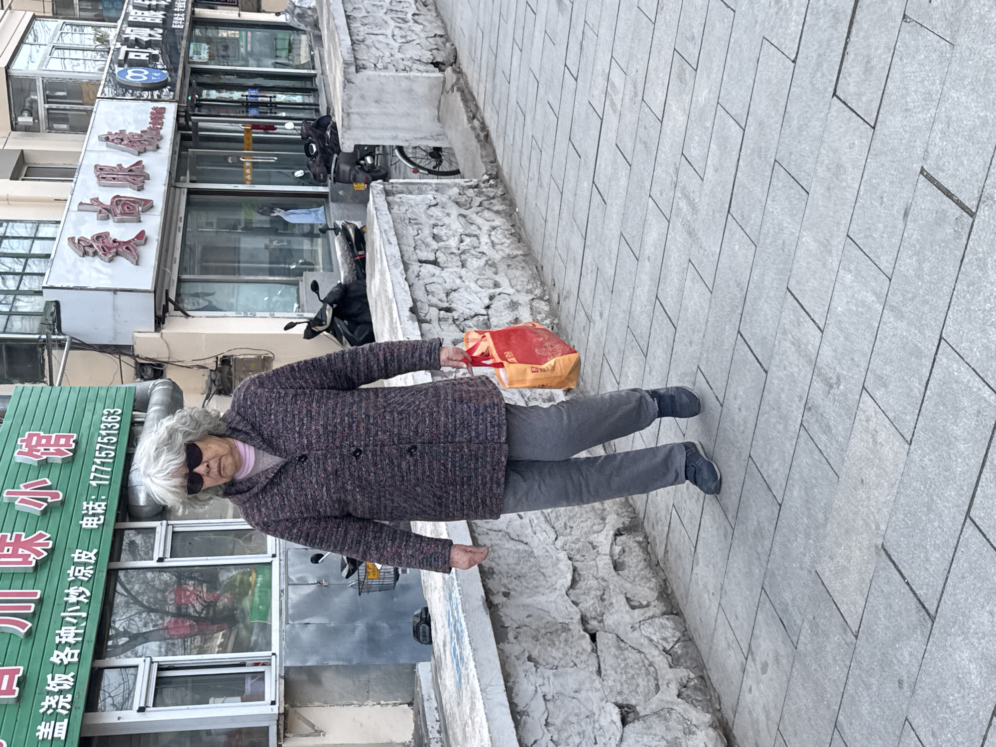 An elderly woman with gray hair, wearing sunglasses, a purple coat, gray pants, and dark sneakers, is walking on a gray-tiled sidewalk in Guta, China. She is carrying an orange and tan shopping bag in her right hand. To her left is a low, uneven stone wall, behind which is a building with storefronts. A green sign with Chinese writing on it, advertising "Various stir-fries, cold skin noodles," is visible. The phone number 17715751363 is also printed on the sign. Behind her, other shop signs and parked motorcycles are visible.