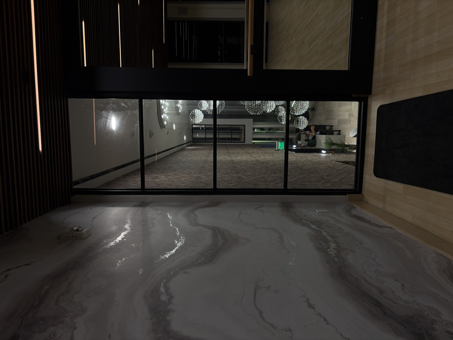 The image showcases a modern interior with a gray marble floor, highlighted by reflective patterns