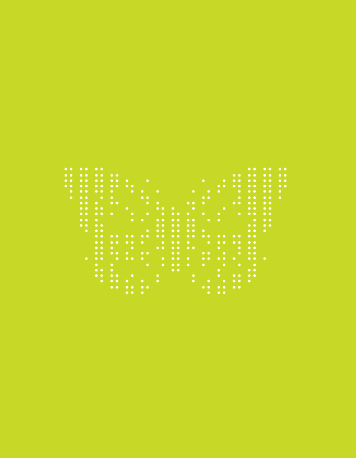 The image displays an abstract graphic representation of a butterfly, centered on a uniform lime green background