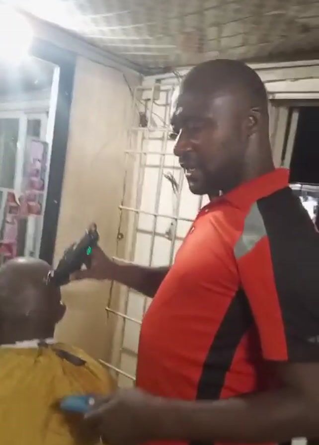 A man in an orange and black polo shirt is giving a haircut to a bald man wearing a yellow cape. The barber is using an electric trimmer on the back of the man's head. The scene appears to be taking place in a small barbershop. There is a window and some equipment visible in the background. The lighting is bright. The barber is looking intently at his work.