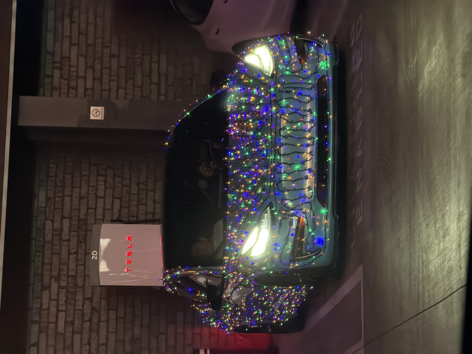 - "A light blue/teal Tesla Model 3, heavily adorned with multi-colored LED string lights (blue, green, red, yellow) across its hood, front fascia, and visible side, is parked at a Tesla Supercharger station in West Hollywood, United States" by FM-yQ80S2, licensed under CC BY 4.0