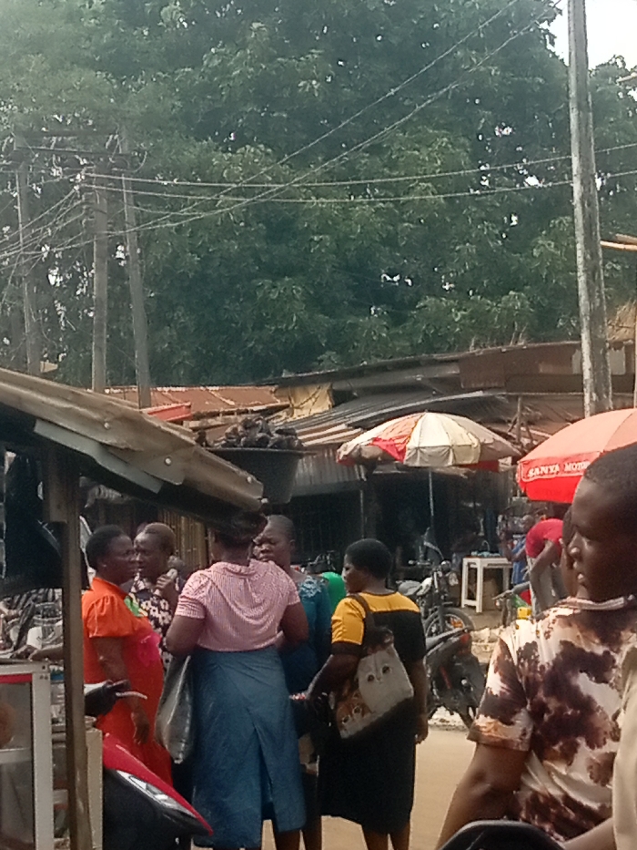 The image depicts an outdoor market or commercial street scene in Nnewi, Nigeria
