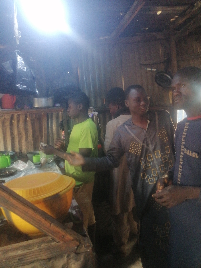 A group of four men are indoors. One man wears a green shirt and stands near a large yellow container. Another man wears a patterned, gray-blue shirt. The third man wears a long light-colored shirt. The fourth man wears a dark blue shirt and stands near a window. The structure appears to be made of corrugated metal. Cooking utensils, cups, and dishes are visible on a shelf. A fan hangs from the ceiling. The room is dimly lit.