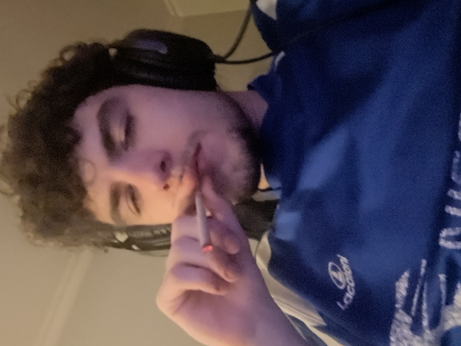 An indoor scene, likely within a residence in Bragança, Portugal, features a young adult male. He has dark, curly hair and light facial hair, and is shown looking downwards with partially closed eyes. He wears black over-ear headphones and a blue long-sleeved shirt with white shoulder accents and a visible "Lacatoni" logo on the left chest. His right hand holds a lit, hand-rolled cigarette or joint to his lips, the tip glowing red. The background is an indistinct, light-colored wall.