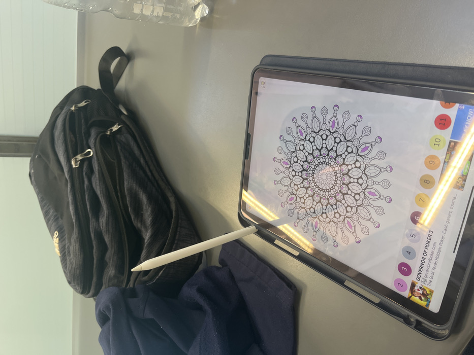 This image captures an indoor scene on a light gray table surface, situated in Burjassot, Spain. In the foreground, an iPad Pro tablet encased in a black folio cover is angled towards the viewer. Its screen displays a digital coloring application featuring a symmetrical, mandala-like pattern, partially colored with various shades of purple. A numbered color palette (1 through 11 visible) is present along the bottom edge, alongside an advertisement for "GOVERNOR OF POKER 3." An Apple Pencil is magnetically attached to the right side bezel of the tablet. To the immediate left of the tablet, a folded dark blue fabric item is positioned. Further back and to the left, a gray and black Adidas backpack with several zippered compartments rests on the table. To the far right of the frame, a clear plastic water bottle, partially filled, is visible. The background reveals a light-colored wall or partition, possibly featuring a horizontal frosted or translucent panel. Reflections of overhead artificial lighting are visible on the tablet screen and the tabletop. No individuals are present in the scene.