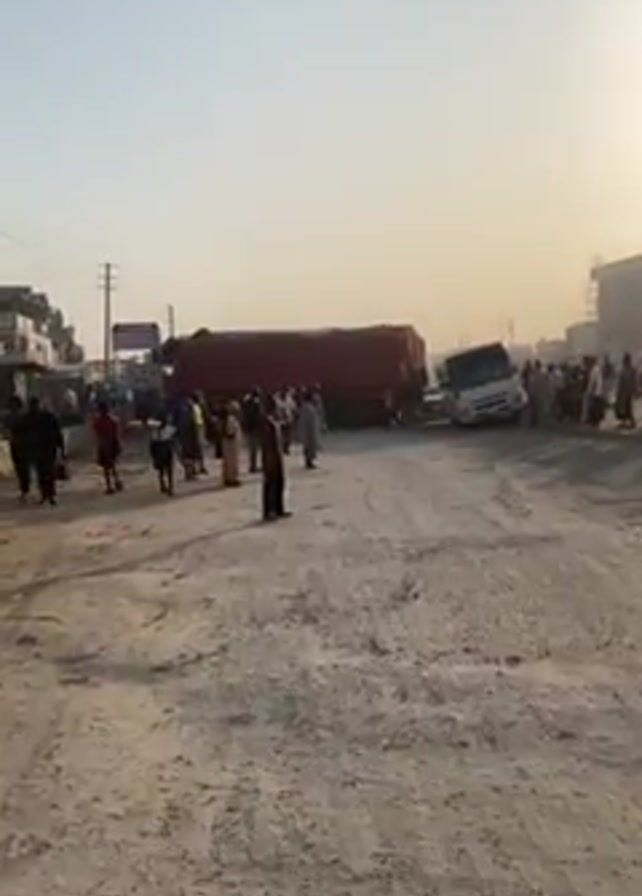 The video depicts an outdoor scene on a dirt road, where a large, maroon-colored truck appears to be obstructing the path. A smaller, white truck is also visible near the larger one, possibly involved in an incident. A crowd of people has gathered around the trucks, some of whom seem to be observing the situation, while others are walking around or past the area. The environment appears somewhat dusty or hazy, with buildings visible in the background. The sky is bright, and the overall setting suggests an urban or semi-urban area.