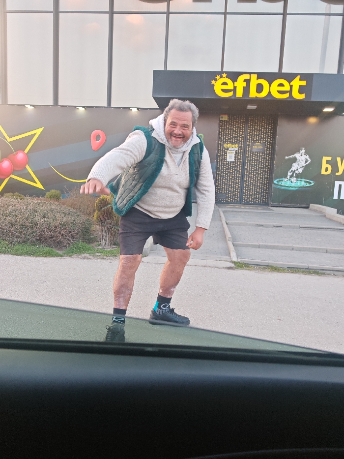 A smiling, middle-aged to elderly man stands on a paved surface in front of an Efbet betting shop in Sofia, Bulgaria. The man has grey hair and a beard, wearing a beige hooded sweater, a dark green fur-lined vest, black shorts, and black athletic shoes with mismatched socks (one solid black, the other black with a teal design and white logo). He holds a wide, slightly hunched stance with arms bent and extended, looking directly at the camera. His lower legs exhibit patches of lighter skin discoloration. The Efbet establishment features a prominent yellow logo with two stars, a dark facade adorned with graphics including a yellow star, red cherries, a red map pin, a white silhouette of a soccer player, and Cyrillic text. The building has large upper-story windows and an entrance with both a ramp and stairs. Green bushes line the base of the building. The photograph is taken from within a vehicle, with a portion of the car's interior visible in the lower foreground.