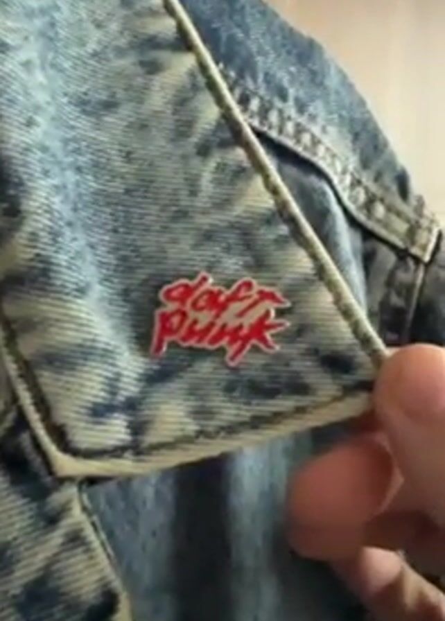person attaching a red "Daft Punk" pin to the pocket of a light blue denim jacket. The jacket is hanging indoors, presumably in a closet or on a door. The person's hand is visible as they manipulate the pin into place on the pocket flap of the jacket. The music playing in the background suggests an upbeat, possibly electronic, genre.