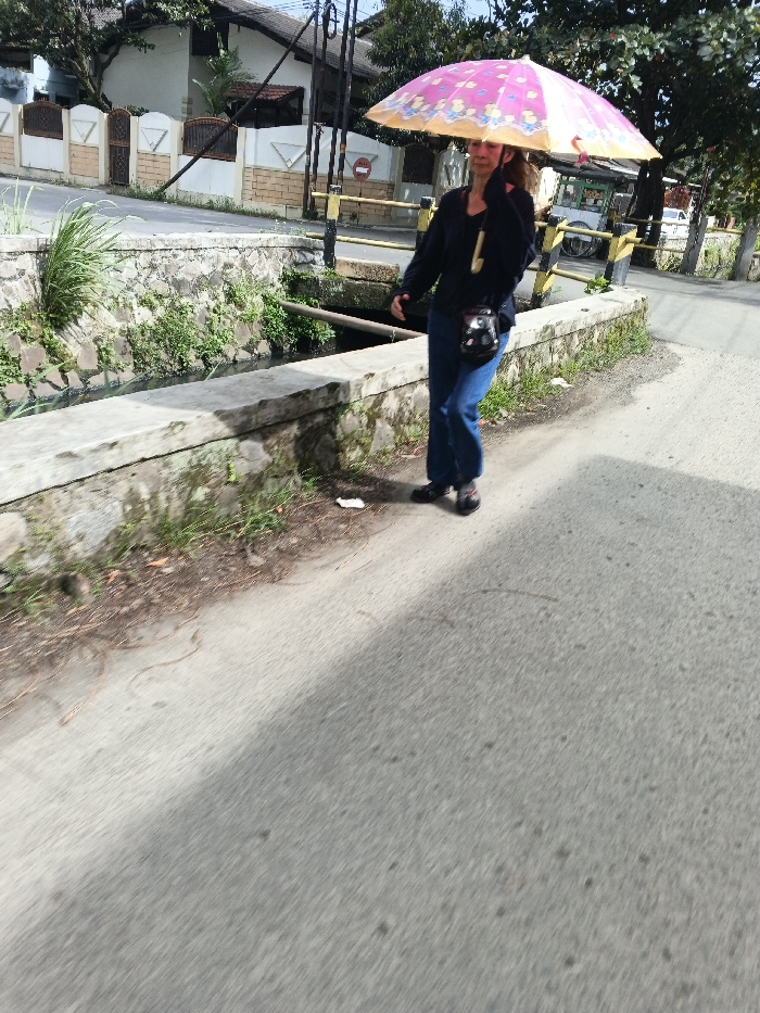 An adult female walks on an asphalt path under bright daylight in Margahayu, Indonesia
