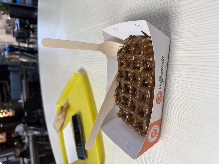 - "An overhead-angled photograph depicts a Liege-style waffle served in a white cardboard tray on a light wood-grain table surface in an indoor food establishment in Matosinhos, Portugal" by FM-yApym1, licensed under CC BY 4.0