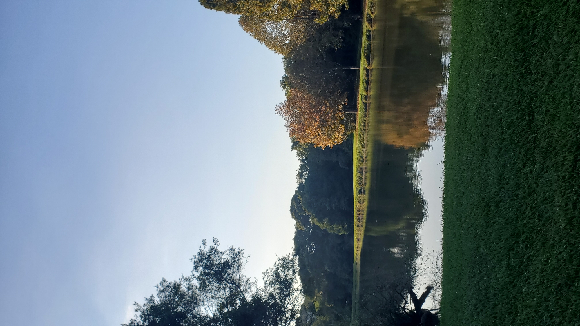 The image displays a serene outdoor environment featuring a clear, light blue sky in the upper portion, suggesting daytime conditions. The central and lower-middle sections are dominated by a tranquil body of water, identified as a lake within a park setting in Curitiba, Brazil. The water surface exhibits slight ripples and reflects the sky and the trees on the opposite bank. The immediate foreground consists of a horizontal strip of dark green, mown grass. Across the lake, a narrow band of lighter green grass delineates the shoreline, beyond which a dense line of trees forms the background. A prominent deciduous tree, situated slightly right of the frame's center on the far bank, is distinguished by its vibrant golden-orange foliage, reflecting clearly in the lake's surface. Other trees along the far bank exhibit varying shades of green and some lighter, possibly autumnal, leaf colors. The branches and dark foliage of another tree are partially visible in the upper-left quadrant of the image. No human subjects, animals, or discernible man-made objects are present within the scene.