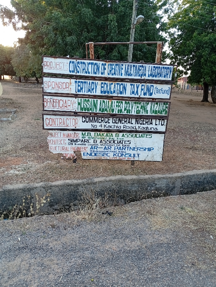 project sign for the "Construction of Creative Multimedia Laboratory." The project is sponsored by the Tertiary Education Tax Fund (Tetfund), with Hussaini Adamu Fed. Polytechnic Kazure as the beneficiary. Commerce General Nigeria LTD. is the contractor, located at No 4 Kachia Road, Kaduna. M.B. Dakata & Associates is the project manager. Simparc & Associates is the architect. AR-AR Partnership is the structural engineer. Endesec Konsult is the engineering consultant.