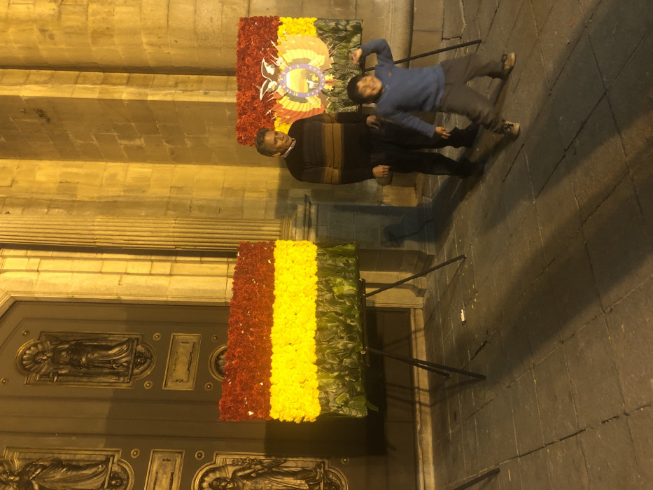 Two people pose beside Bolivian flag arrangements made of flowers and leaves. One flag is a standard tri-color, the other includes the Bolivian coat of arms. The people appear to be smiling and enjoying themselves. The scene is outdoors, likely at night, in front of a large building or church with ornate door carvings. The picture is rotated counterclockwise.