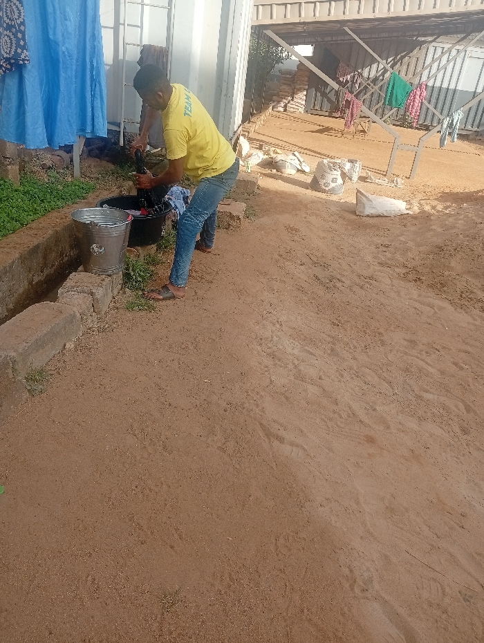 An individual in a yellow shirt and blue jeans washes clothes in a black tub placed on the ground. A silver bucket sits nearby. Washed clothing hangs on a rack in the background, near a white building. The ground is covered in reddish-brown dirt. A concrete structure with greenery is visible on the left, with blue clothing hanging.