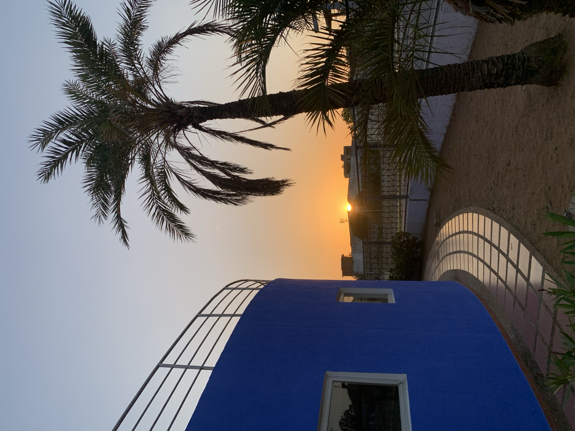 This image shows a sunset scene in Juan Griego, Venezuela. The sun is setting behind buildings, creating a warm orange glow in the sky. A palm tree is visible on the left side of the image, and another palm tree is on the upper right side. A blue structure with windows and a metal railing is in the foreground. A curved walkway is made of brick that transitions from concrete to dirt.