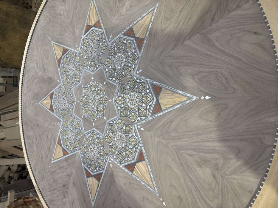 top surface of a circular wooden table, likely a dining table. The table is made of a dark wood, possibly walnut, and features a large, intricate star-shaped inlay. The inlay is composed of various woods, including light and dark wood, and is surrounded by a thin, silver-colored band. The inlay is comprised of eight pointed arms, each of which has a geometric pattern of overlapping smaller polygons and appears to be made of different kinds of wood. The table is the subject of the image and is positioned directly in the center of the frame. It is unclear where in Sbeneh, Syria the table is located, but the coordinates provided suggest that it is near the outskirts of the city.