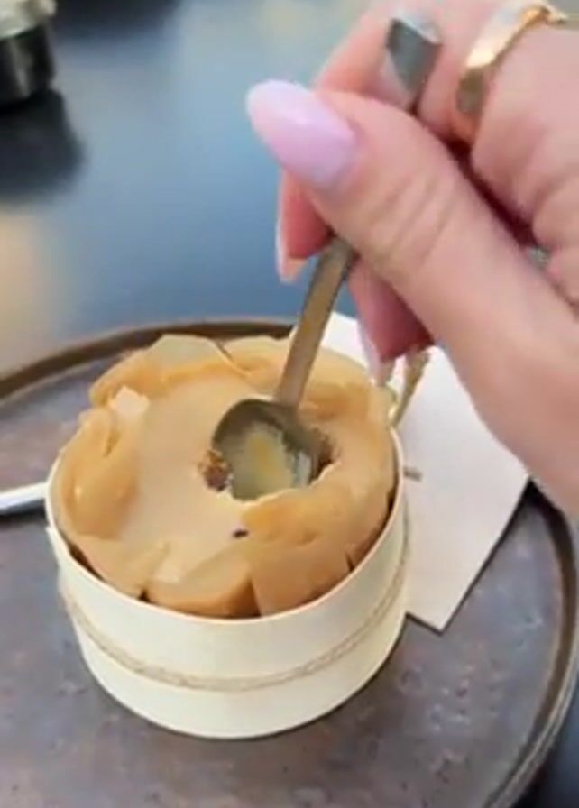 Here's a detailed description of the video: The video shows a dessert being eaten. The dessert is inside a small, round, white container with a rope accent. The dessert itself appears to be a ring of a light-brown color, with a hole in the middle. Pieces of crumpled parchment paper line the inside of the container. A person with light pink nail polish is using a silver spoon to scoop out the inside of the dessert. The spoon is lifted, revealing a portion of the dessert with small, dark-colored bits mixed within. The dessert is sitting on a circular, dark-gray tray. A folded white napkin is to the right of the dessert container, and a small black container is visible in the background. The table surface is glossy and reflects the surrounding light.