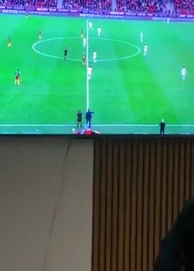 televised soccer game being watched in a room. The soccer match, with players in white and colored uniforms, is in progress on a bright green field. A referee is also visible. The stadium is packed with a crowd, mainly in red clothing. In the foreground, a person wearing a dark jacket is partially visible, seemingly focused on the game displayed on the flat-screen TV. The wall behind the TV has vertical wooden panels.