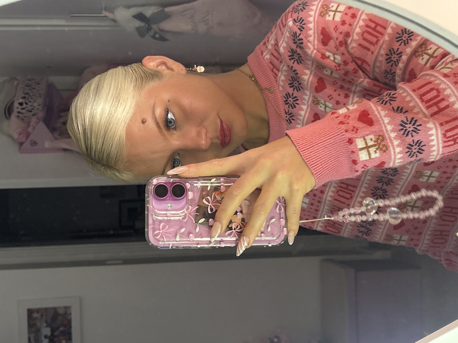 A woman with blonde hair and blue eyes is taking a selfie in a mirror. She is wearing a pink Christmas sweater with snowflakes, hearts, and presents. Her phone has a pink case with a floral design and a beaded wrist strap. The reflection shows a cluttered room with various items on shelves.