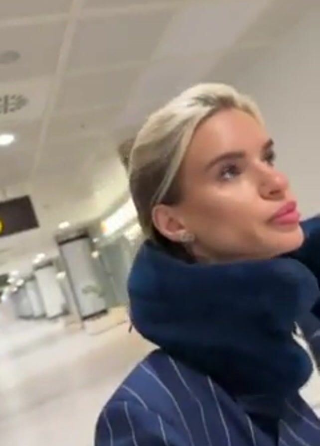 A woman with blonde hair and wearing a blue travel pillow around her neck and a navy pinstripe blazer walks through an airport terminal. Overhead signs read "9:10". The airport terminal appears relatively empty.