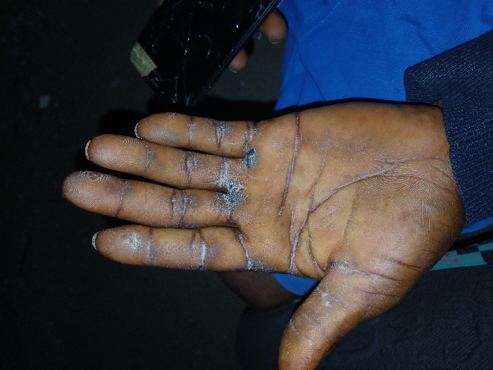 This image, captured in the city of Zango-ndaji, Nigeria, displays a close-up, downward-angled view of an individual's left hand. The hand, exhibiting a dark skin tone, is presented palm-up with fingers extended. A white, powdery residue extensively coats the palm, finger creases, and fingertips. Distinct dark, charred or singed marks are visible on the palmar aspect of the middle and ring fingers, specifically near their bases. A blue fabric sleeve is partially visible around the wrist and lower right, with a patterned fabric below the hand. To the right of the hand, a black smartphone with a severely cracked screen is partially present, featuring a piece of light-colored tape applied near its top edge. The background is dark and out of focus, indicating low light conditions.